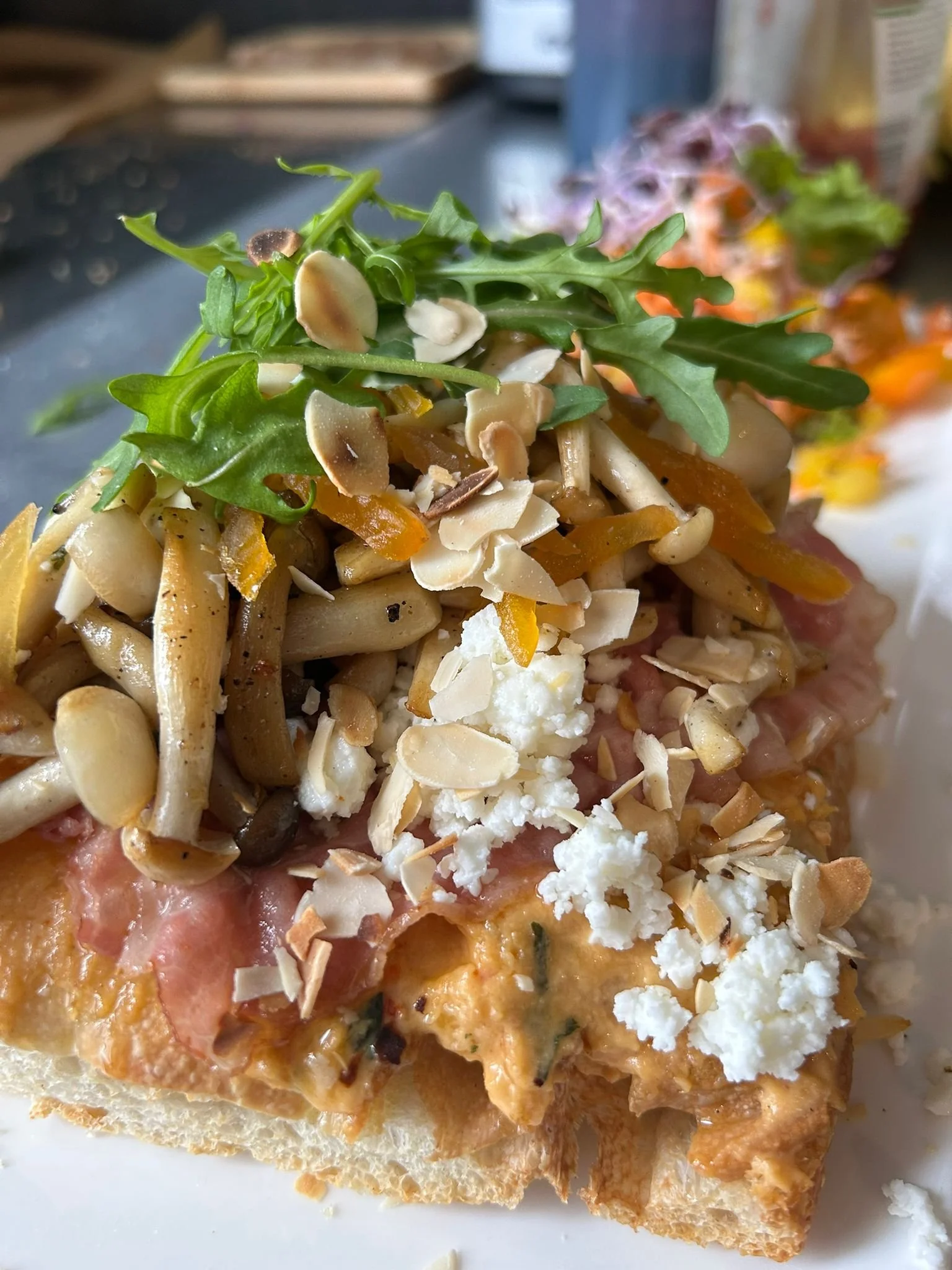 Loaded Focaccia hummus met abrikoos, feta, spek, amandelschilfers, gedroogde abrikoos en boschampignons